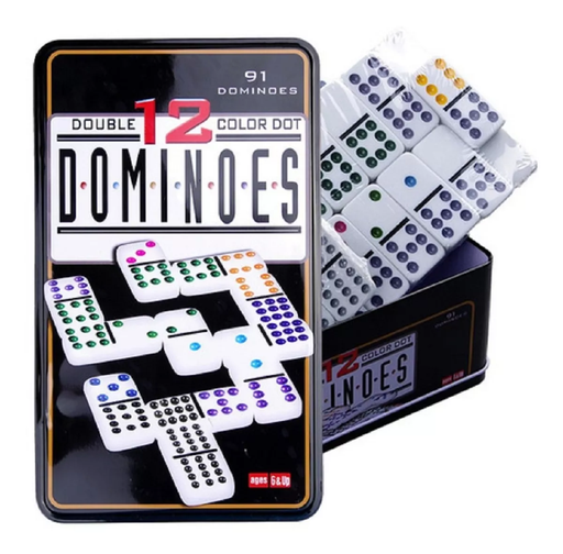 Juego de dominó con puntos de 12 colores en caja de colección de lataEl máximo grado de dificultad para el dominó, en lugar de 6 puntos, ésta versi...