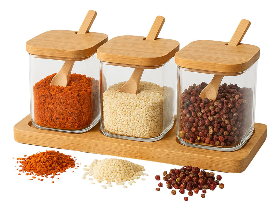 Incluye 3 frascos transparentes con tapa hermética de bambú